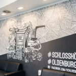 Für eine Art Suchbild / Collage verwandelten wir bekannte Orte und Gebäude Oldenburgs in Comicfiguren. Vom Horst Janßen Museum bis zum Pulverturm. Verbunden wurden die Figuren mit den Schlosshöfen selbst und verschiedener Einkaufsmöglichkeiten vor Ort.